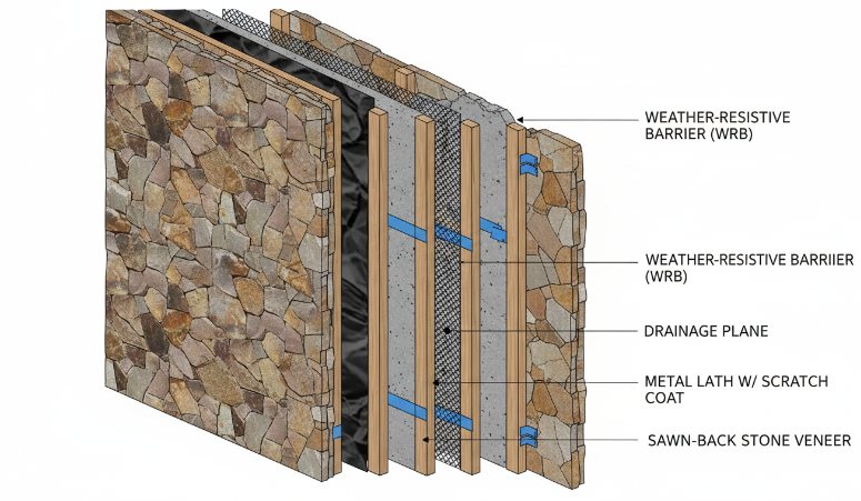 Tight joints create the best look, but they must not compromise the wall’s ability to shed water. In 2026 exterior standards, we emphasize using high-strength polymer-modified mortars that remain fully covered by the stone yet allow for incidental moisture to reach the drainage plane. The goal is to encapsulate the back of the stone entirely. This ensures a permanent bond and prevents stones from shifting, which is the primary cause of exposed substrates in aging dry-stack installations.