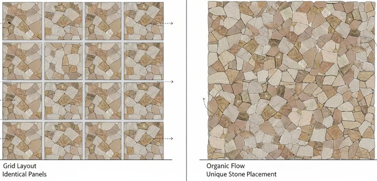 The stone veneer market currently splits between modular Z-shape panels and individually hand-laid loose stones. Modular systems attempt to eliminate vertical grout lines through nesting designs, which certainly speeds up the installation timeline for high-volume commercial projects. However, the industry’s shift toward a “Bespoke Random-Lay Pattern” highlights the limitations of pre-glued panels—specifically the repetitive patterns that become visible on large-scale facades. By using individually sawn-back stones, we allow installers to nest units tightly against one another, concealing the underlying substrate without the mechanical look of a factory-assembled grid.
