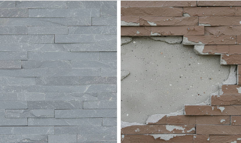 - Damage to faux stone exposes dull gray concrete, creating an immediate and obvious visual defect.