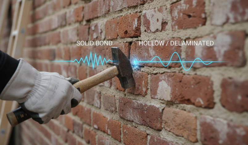 We use percussion testing to verify the internal density of the brick substrate before any material is staged. Striking the surface with a masonry hammer or a solid metal tool should produce a sharp, ringing tone, signaling a solid connection to the backup wall. This resonance confirms the brick remains dense and firmly attached to the structural substrate.