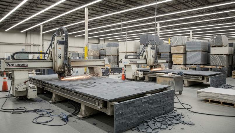 Texas Custom Granite Co. in Houston operates a 60,000 sq. ft. facility equipped with dual Park Industries machines, producing 3,750 sq. ft. per week of high-end custom countertops for commercial builders. This setup emphasizes machine redundancy to avoid downtime and ensure rapid production.